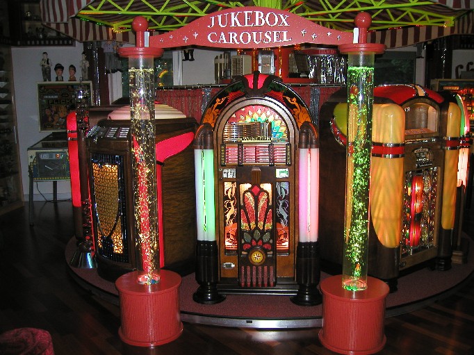 In der Mitte, die legendäre und begehrte Wurlitzer 950 aus 1942. Ingesamt drehen sich 10 Jukeboxen mit dem Karusell.