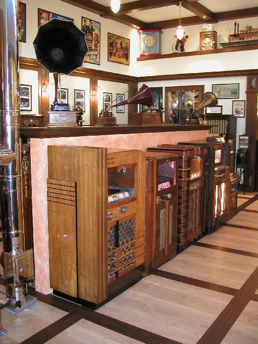 Eine frühe Seeburg Serie: Symphonola Mod. D, 1935, Symphonola A, 1935, Symphonola H, 1937, und die Rex. Oben ein Edison Fireside sowie Gem Phonograph.