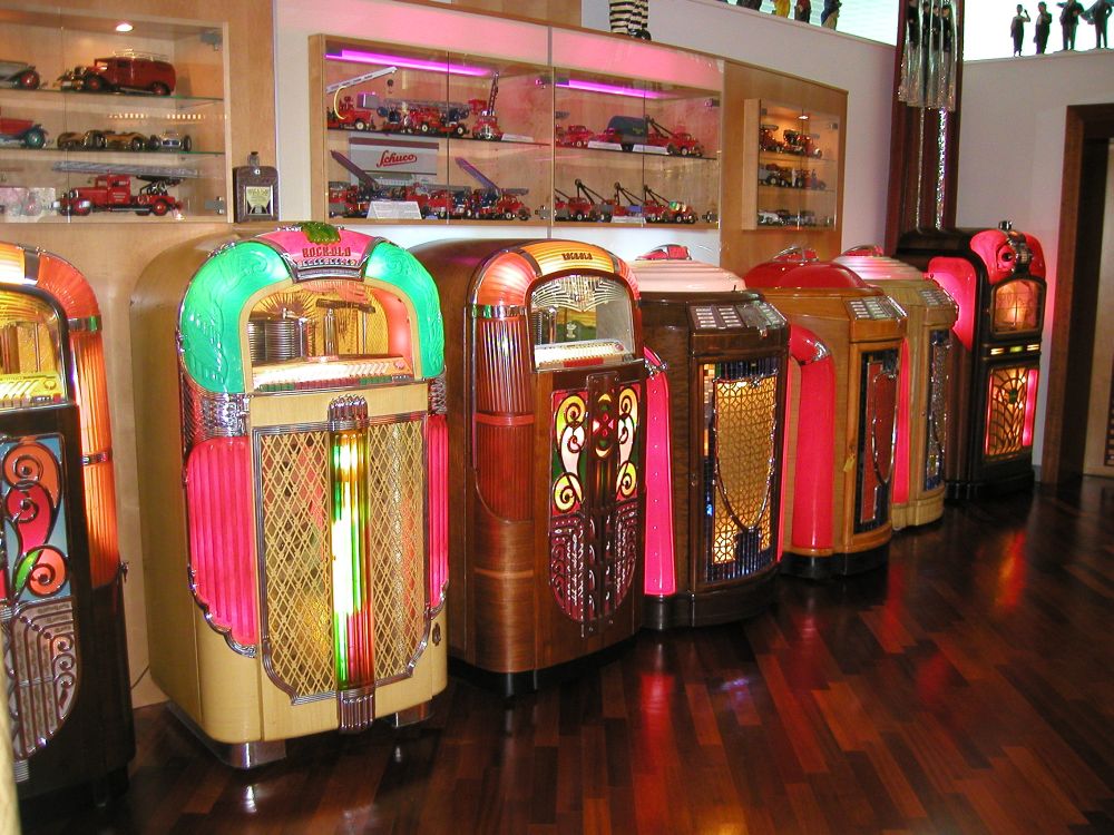 Von links: 3 mal Rock Ola, 1422, (1946), 1428, (1948) und 1426 (1947). Dann 3 mal Seeburg "Trashcan's, 147, (1947), 148, (1948) sowie die 146 aus 1946. Den Abschluss bildet eine Packard Pla Mor, 1946