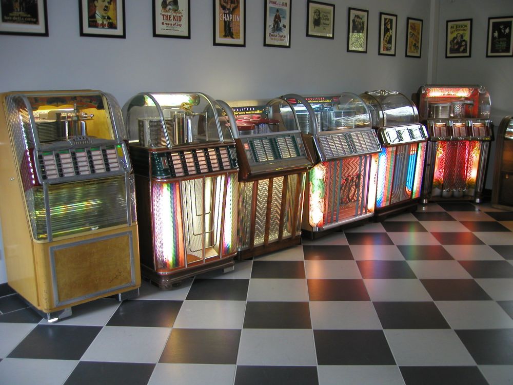 Die letzten der Schellackboxen: Rock Ola 1432 und 1436, Wurlitzer 1600, 1550, 1400, 1250.