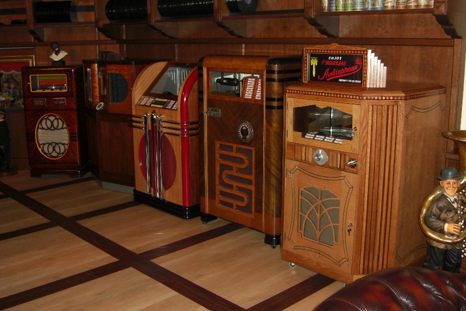 Im Vordergrund: sehr seltene Seeburg Audiophone F (1931), Gabel's Charme (1936), AMI Top Flight (1936) und in der Ecke die Rarität Wurlitzer 50 (1937)